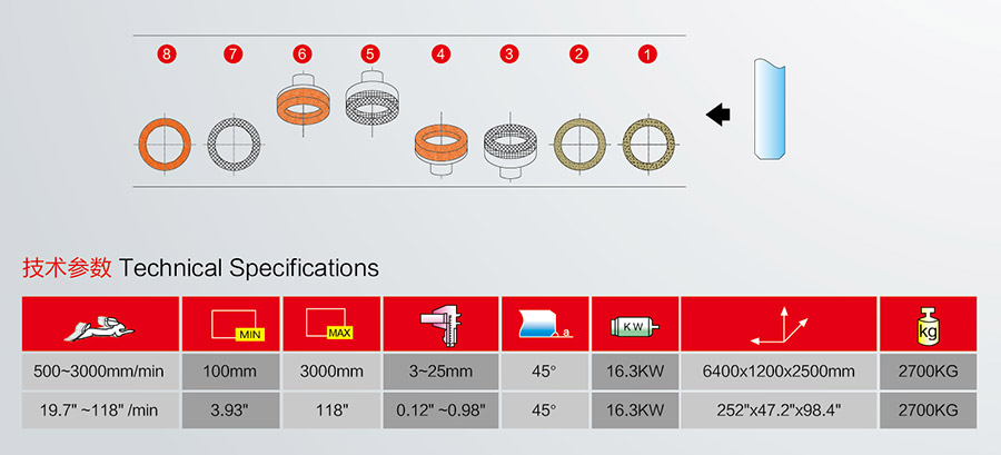 This machine is used to grind the hemline and two chamfering of flat glass .Rough feed,fine feed and polishing can be completed by one time process. It adopt the stepless motor adjust the speed,there are “quick” and “slow”two range of speed,can change speed smoothly in a big range,easy operation.